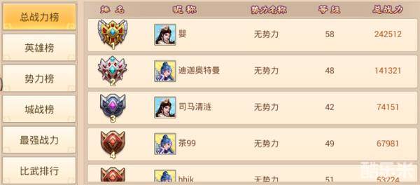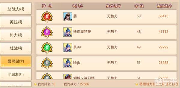最强战力:是指君主所拥有的将领战力前五之和进行排名,排名前三可以获得徽章。最强战力也就是意味着,你可能是在是征战天下能排到第一位置的比较大的决定因素。