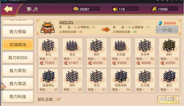 势力攻城时可以在攻城略地里面派遣自己拥有的部队去增援。也可以清楚看到每个玩家部队的等级和战力。