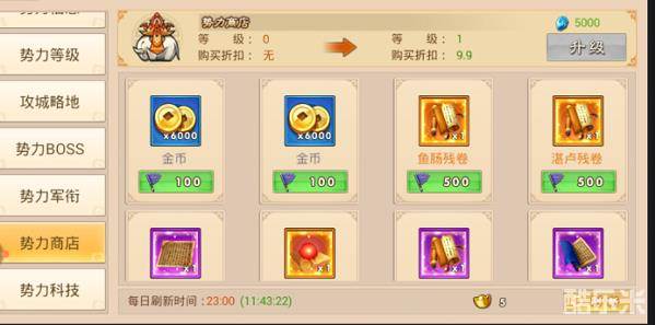 势力商店每日24小时刷新一次,只能用功勋购买,势力资金可以提升势力商店等级越高打折越多。可以用元宝刷新商店物品。