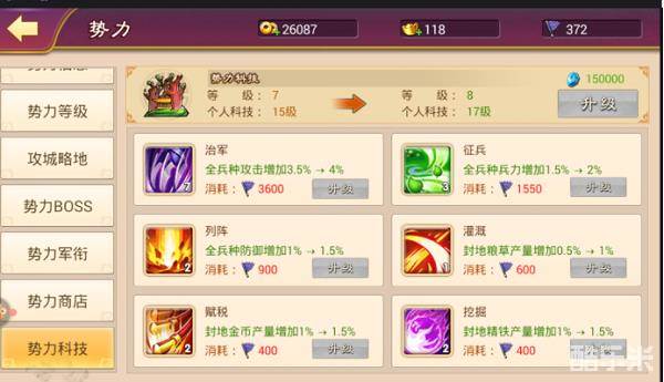 势力科技等级越高所能提升的各项BUFF越高,需要用势力资金来提升等级。每项BUFF都有明确的提示。只能用功勋来提升科技。科技越高所能提升的战力越高。