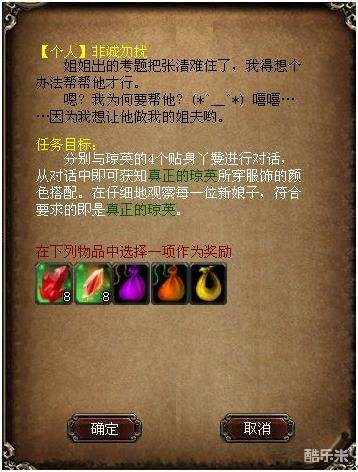分别与琼英的4个丫鬟对话,结合对话分析与观察4个琼英的服饰颜色,推理出正确答案,并在交回任务时选择正确的选项。