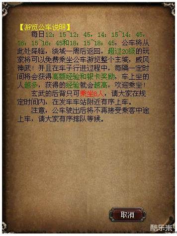 血盟为了每日便民生活,宣扬血盟实力,在固定时刻开启了公共汽车活动,请玩家广为参与。每日13:00~14:00和18:30~19:15,神兽玄武将从发车点降临,绕城一周后返回此地,超过20级的玩家将可以免费乘坐神兽玄武游览全程,威风神武!并且在车子行进过程中,每隔一定时间将会获得高额经验和银卡奖励,欢迎乘坐!
