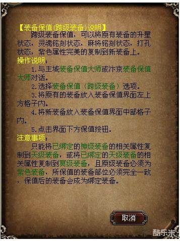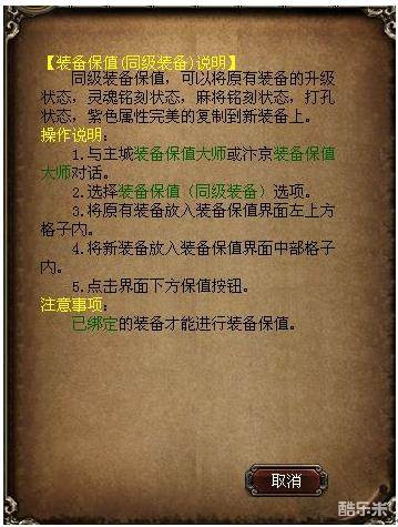 1、只有绑定的装备才能进行装备保值。