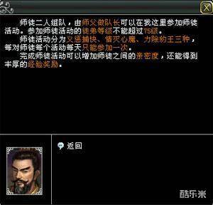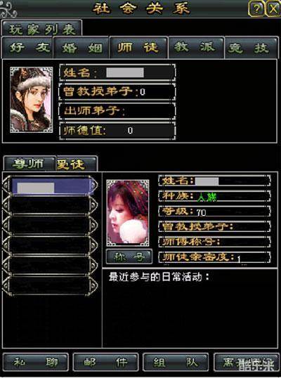 按下F10键打开社会关系界面,就可以看到你的师傅了。除了可以看到对方的一些信息外,还可以直接通过社会关系界面与师傅组队和聊天。另外,你还可以与其他玩家自愿组成师徒关系,双方组队找到瓦当镇总教头【101,74】,符合条件就可以结为师徒关系,注意:同电脑双开不能结为师徒关系。