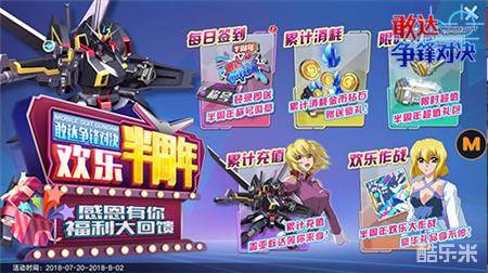 时值《敢达争锋对决》半周年,官方推出了《欢乐半周年》的纪念活动,活动类型丰富,包含:签到有礼、累计消耗、限时礼包、累积充值和欢乐作战等数个子活动一起进行。通过活动更可以获得《机动战士高达SEED Destiny》的著名女性角色史黛拉和座机盖亚高达。如果觉得自己的MS部队实力还不足,这可是一次非常好的机会。