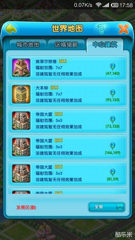 很多不懂行情的新手看着高级玩家建立起高大上的建筑,比如帝国大厦,自由女神(配图),看着这些建筑带来的巨大加成纷纷心动不已,于是都开始存钱造高级建筑,可是满心欢喜建立起来之后发现根本无法升级,高级建筑需要多技能人才,并且要有技能书把技能升到对应要求的等级才能升级建筑,所以花了大价钱建立的建筑没有带来丝毫加成反而会带来每日维护费,顿时有一种被欺骗的感觉(当时我造人工湖就是这个感觉,不过还好是人工湖,后面升级并不困难),并且浪费了前期发展的资金,可谓得不偿失,所以广大新手朋友们一定不要被高级建筑的外形迷惑,量力而行!(这个你点开发展区的中心建筑,我看见不少帝国大厦,甚至还有埃菲尔铁塔,全是一级没有丝毫效果,明显是被坑了)