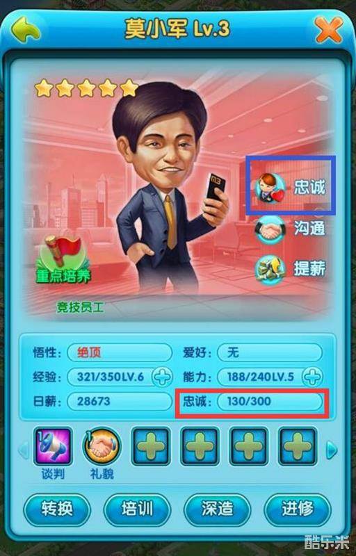 员工忠诚这方面比较容易被忽略。很多人往往没注意到员工忠诚过低,而且十六级之前不开放挖人 ,所以对这方面不够重视, 结果到了十六级之后,自己辛苦培养的高星高级员工被别人莫名其妙的挖走,顿时心在滴血,损失惨重,(高星高级员工无论是竞技,商海,还是店铺加成,竞争,游戏的各个方面都是最重要的力量,这个又是一大堆进阶技巧,不详谈),所以把重要的员工标记重点培养(配图),每天提薪水,喂饼干,可以有效防止员工被挖走。