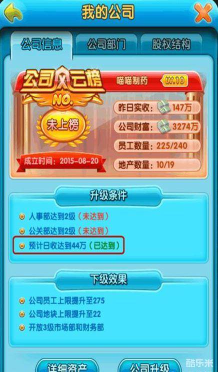 由于许多功能会绑定等级条件,所以想要尽快开启功能就需要快速升级。首先说说升级条件,公司升级的条件: