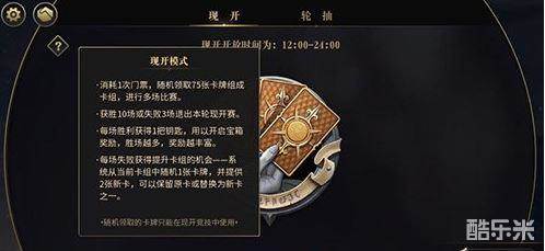 现开模式下玩家需要花费一张门票或是六百金币,然后随机获取75张卡牌(20级解锁天赋后可以有80张),获胜十场或者失败三场则退出现开赛,胜利一场可以获得一把宝箱钥匙,获胜次数越多则宝箱奖励越为丰厚,每次失败可以获得提升卡组的机会,系统会随机抽取一张原卡组卡牌,提供两张新卡牌,可以选择替换或是保留原卡牌。