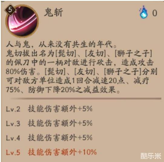 鬼切的三把刀分别附带不同的效果,「髭切」可造成1回合减速20点,「友切」使目标减疗75%一回合,「狮子之子」降低目标防御20%一回合。鬼切普攻时随机拔出一把名刀造成伤害并附加对应的减益效果,伤害随等级提升而提升。