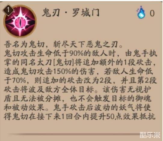 被动技能(能否被般若封印暂不可知,待确认),鬼切攻击生命值低于90%的敌人时,将额外追加一段伤害,伤害值为鬼切攻击力的150%,若被攻击的目标生命值低于70%,则追加的伤害改为两段,且第二段砍击波及敌方全体,这个伤害无视护盾且不会被分摊,也不会触发目标的御魂和被动效果。鬼手砍击后会提升鬼切50点效果抵抗,持续一回合。