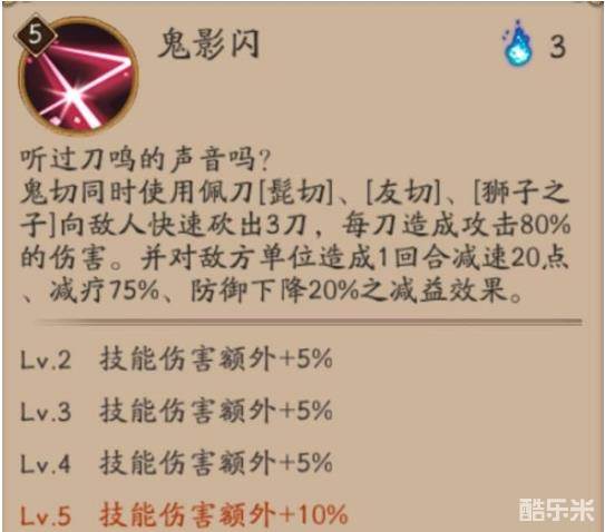 鬼切使用三把刀砍向敌人,每把刀造成鬼切攻击80%的伤害,并附加对应的减益效果。