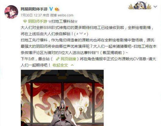 阴阳师官博发布的声优猜测,作为剧情中的鬼切的主人,源赖光的人气也不低。