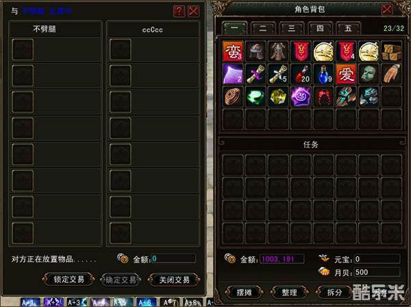 - 同意进行交易——双方将交易物品放入交易界面中的物品栏中(鼠标左键拖动物品图标或鼠标右键点击物品图标)