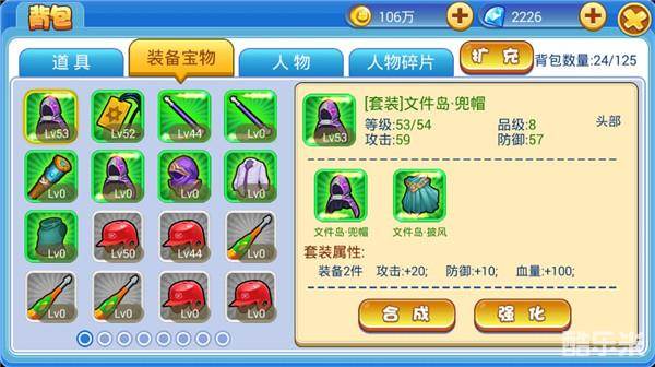 背包分为道具、装备宝物、人物和人物碎片四个页签。