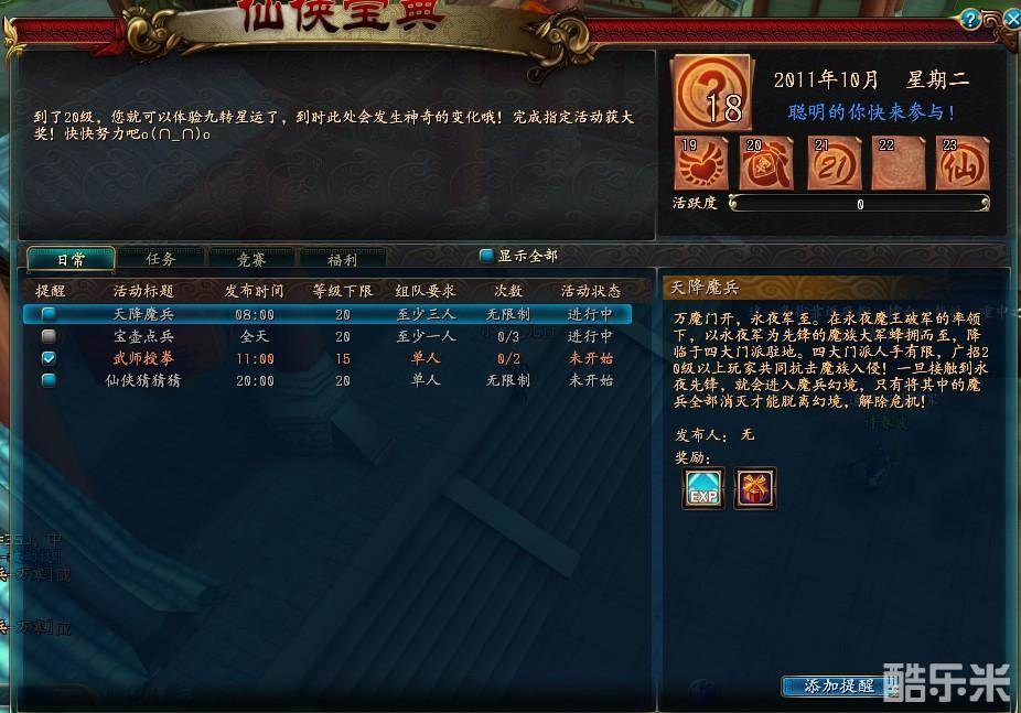 天降魔兵是每天的0点2点4点这样每隔2个小时刷一次,具体门派贡献有什么用怎么刷到时候就会懂了。就这样每天把九转做完,刷刷小鬼,另外也别忘了做做运粮任务,每天都可以接的,一天30次可以增加储备金。储备金的用处也是相当大的,而且以后用到储备金的地方太多了,用到的储备金回事很大的一个数目!所以每天坚持做运粮是没有错的!有人会问我运粮在哪点做,还是按快捷键Q下面有好多任务,在哪里找找就能找到了。
