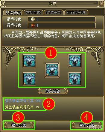 2、打开装备合成界面,并放入装备,最后点击“银币合成”或“铜币合成”按钮。