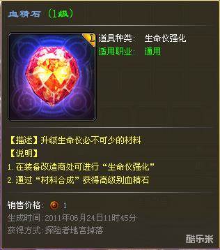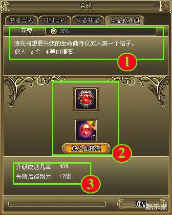 2.、打开生命仪升级界面,并放入生命储存仪和血精石,最后点击“升级”按钮。