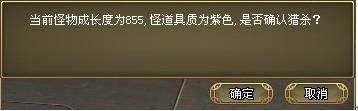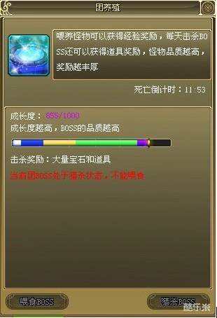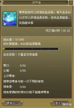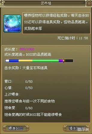 3.喂食BOSS,喂养怪物,每次喂养会增加怪物的成长度和饱食度,并影响怪物的心情,玩家同时获得一定得经验奖励,每个玩家每天限制喂养十次。操作时点击“喂食BOSS”,出现下面提示: