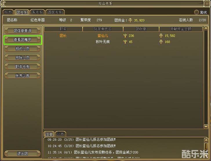 按快捷键“O”,可打开社会关系界面,点击“团关系”及“查看团魔甲”可查看当前团魔甲。
