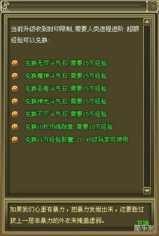 封印系统的设计目的是拉近低等级玩家与高等级玩家之间的差距。当玩家等级到达封印等级并且经验达到一定数值,则经验无法累计,经验可以兑换历练勋章、经验胶囊和各种斗气石。