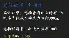 高级破甲:宠物普通攻击时有12%的概率降低敌人的武力防御300点