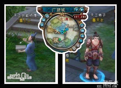 生产技能学习的等级要求是角色达到10级,学习生产技能的NPC是天工技能师傅墨小二。墨小二边上的天工弟子墨天衣是打造NPC。位置为广陵城约333,284这里,如图: