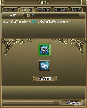 2.打开装备镶嵌界面,放入已打孔的需要镶嵌的装备和金刚钻,最后点击“开始镶嵌”按钮。