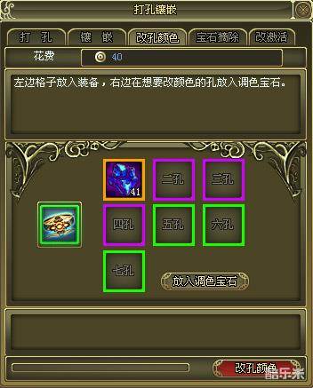 2.打开改孔颜色界面,放入需要调整的装备和调色宝石,调色宝石放置需要调整的孔洞位置,最后点击“改孔颜色”按钮。