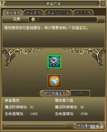 2.打开属性精炼界面,放入需要修改基础属性的装备和祝福宝石,最后点击“开始属性改造”,每次属性精炼需要消耗1个祝福宝石。