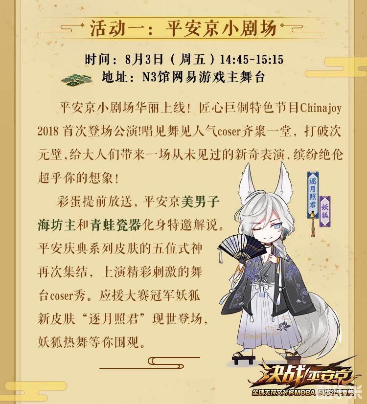 Chinajoy是全球泛娱乐领域极具影响力的年度盛会,《决战!平安京》在本届CJ中准备了许多丰富有趣的线下活动及表演,与大人们共度盛夏狂欢。8月3日14:45-15:15期间,《决战!平安京》精心筹备的特色节目——平安京小剧场将在ChinaJoy上首次登场公唱!唱见、舞见、人气coser都将齐聚N3馆网易游戏主舞台,以绝伦之姿为大人们带来一场超乎想象的新奇表演。