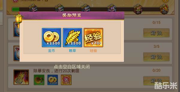 保证每天能按时完成每日任务。在日常任务中不仅能获得大量的金钱,粮草。更能获得可观的经验值,是升级的重要途径。
