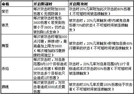 阴谋与阳攻状态切换有30分钟冷却,若冷却中需进行切换,需消耗100礼券/元宝。玩家初始可选择点击【激活】按钮,选择紫芒、青灵、舞雪、赤焰、摄魄五命格中的一种,激活后即可获得相应命格的被动技能。若需解除命格进行切换,需支付100礼券/元宝。