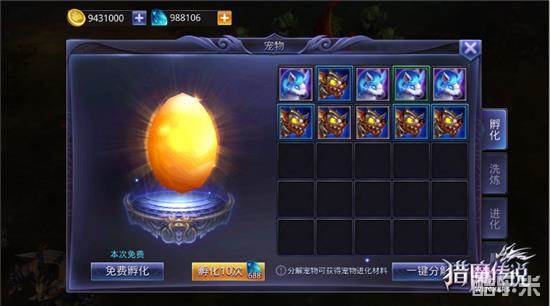 点击宠物界面,进入孵化,消耗钻石进行孵化,或通过登录活动获取相应宠物,目前小伙伴们手上基本拥有地狱恶犬和独角兽马吧。