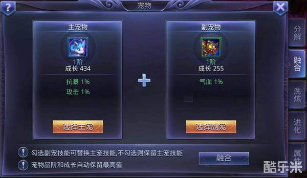 最新版本的《猎魔传说》增加了分解和融合玩法,在分解宠物后,玩家可获取宠物进阶材料。另外融合玩法,主宠属性需高阶过副宠属性,融合后宠物品阶和成长自动保留最高值。