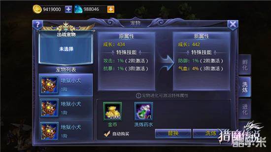 2. 洗练:通过洗练能够为宠物增加随机属性,品质越好,增加的属性越高,从而提高人物属性。