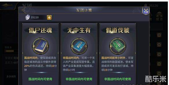 借尸还魂:主要在国战攻城时返还部分伤兵,等于减少军团成员的兵力消耗,能够派出频次的部队,提高攻城效率。