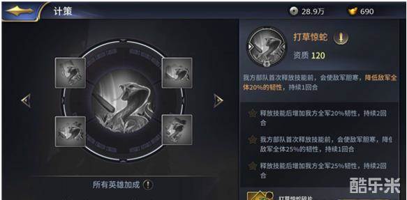 效果:我方部队首次释放技能前,会使敌军胆寒,降低敌军全体20%韧性,持续1回合。适用场景:适用攻击型武将,最好选择技法伤害较高的武将,例如:赵云,关羽,吕布,孙策,配合计策对方韧性降低,能打出更高的伤害值。