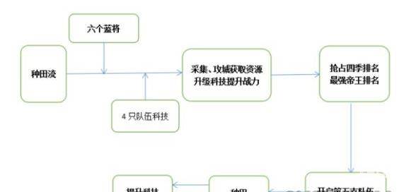 种田流的核心有两点,1、凑齐这6个蓝将并且尽可能升星,三个文官宿命加采集、三个武将宿命加攻城值,星级越高采集和攻城的数值越高;2、科技优先解锁四支部队,一队主力、二、三、四每队配一个采集一个攻城一个将来要培养的金将。这样基本就成型了。早期别人3个队伍采集、攻城你上4队不但人多势众而且专业对口。这样资源获取方面就会大大领先了。这里有两个小技巧,攻城时2、3、4队只打城防、1队打完城防赶紧去抢杀敌军。杀敌和攻城值这两项每项排第一都奖励300金;采集方面有些资源点奖励计策碎片、将魂、加速道具等等要经常采集。