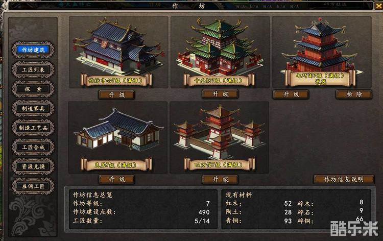 作坊建筑分为五种:作坊中心、十全坊(制造家具)、七巧阁(制造工艺品)、民居(工匠容纳上限)、四方馆(探索等级)。最高都是7级。