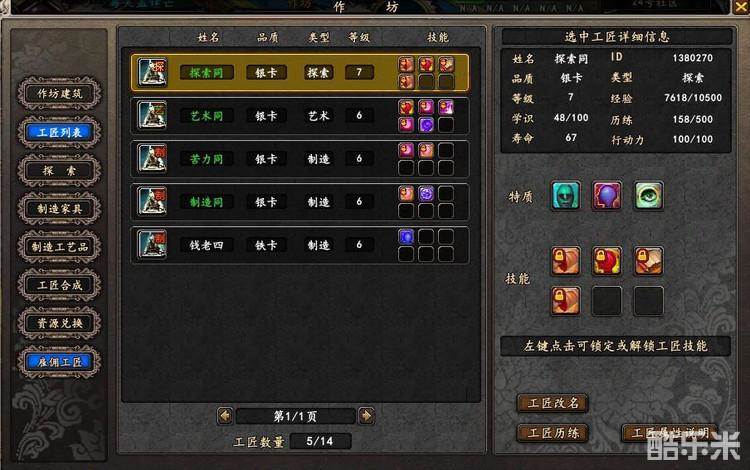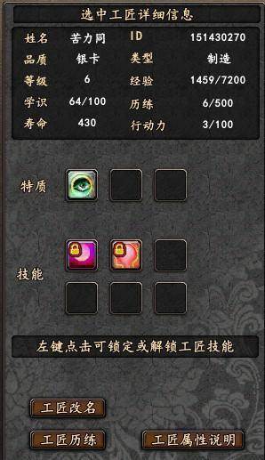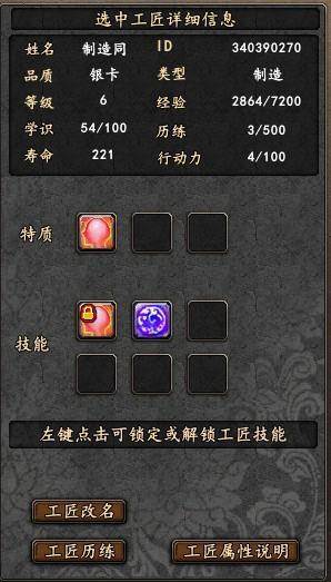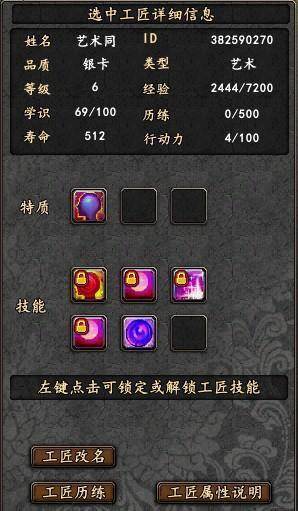 工匠列表清楚显示了你当前所拥有的工匠详情和可容纳的工匠上限,同时,工匠技能的锁定也是在这里进行。工匠技能的锁定只需要在技能图标上点一下即可完成。工匠特质不可锁定。