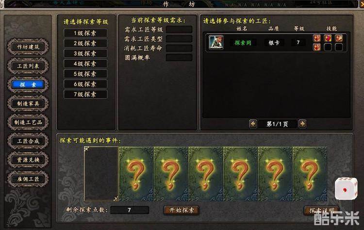 探索可以获得制造型工匠、工艺型工匠、制造材料。探索分为7级,1-6级探索每次消耗1点工匠寿命,7级则是每次消耗2点。每天探索次数上限为50。