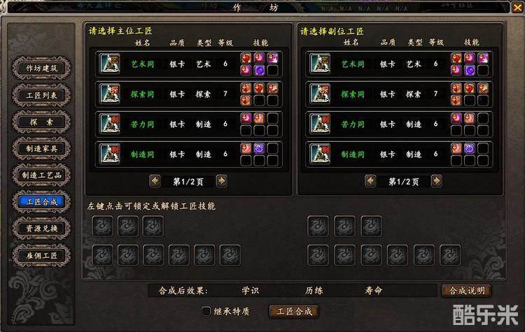 工匠合成可以让工匠有机会获得更多技能,从而让工匠成长更快,探索到更多材料,制造更优质的家具和工艺品。工匠合成也是让工匠生存下去的关键。工匠行动力每天自动恢复十点,但是寿命和学识只能通过工匠合成获得。工匠合成学识达到100后就可以历练,历练值达到一定数值还可以转生出更高品质的工匠。
