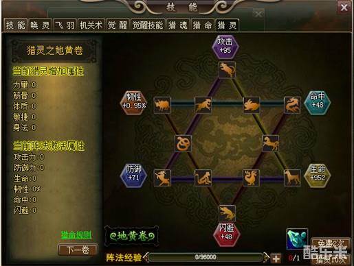 而猎灵激活的生肖满足一定排列时,可消耗阵法经验激活相应的六道阵法,六道阵法会增加大量战斗属性(攻击力、防御力、生命、韧性、命中、闪避)。