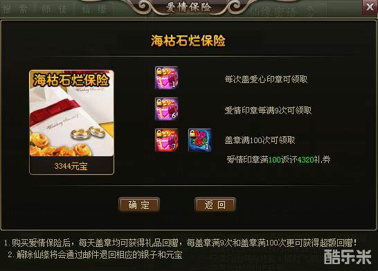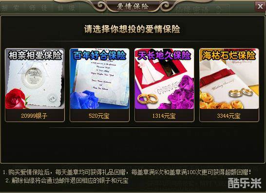 点击【爱情保险】后可以选择不同级别的爱情保险,可以用银子购买,也可以用元宝购买,购买的价值越高,得到的回赠越高哦!