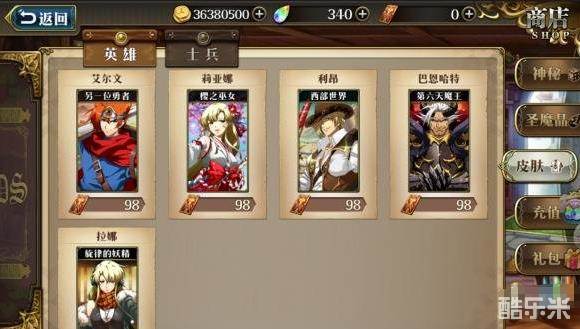 在皮肤商店可以购买英雄皮肤和士兵皮肤,需要使用皮肤劵进行购买。