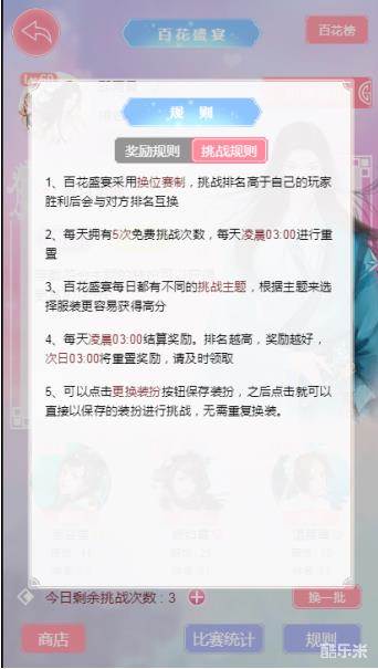 点击百花盛宴主界面的规则-挑战规则按钮可以查看详细的挑战规则
