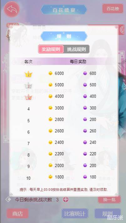 2、每天凌晨3点根据百环盛宴排名结算排名奖励,奖励金币和百花勋章
