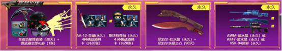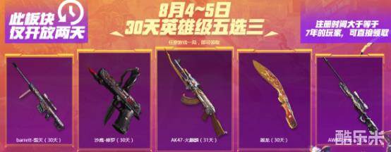 8月4日至8月5日活动开启伊始,为期仅两天的活动版块将首发送出5款30天英雄级武器大礼包。玩家可在4日至5日两天里,任意游戏一局,即可领取barrett-毁灭(30天)、沙鹰-修罗(30天)、AK47-火麒麟(31天)、屠龙(30天)、AWM-天龙(31天)其中三件。为回馈广大老兵,注册时间大于等于七年的玩家,可直接领取道具。