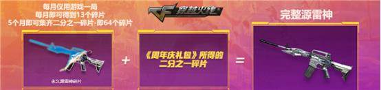 活动期间,玩家领取周年庆礼包中的永久源英雄级碎片后,即可参与集碎片活动。玩家每月仅需游戏一局,每月即可得到13个碎片,5个月即可集齐二分之一碎片-即64个碎片,集齐128个碎片即可合成完整永久源雷神。